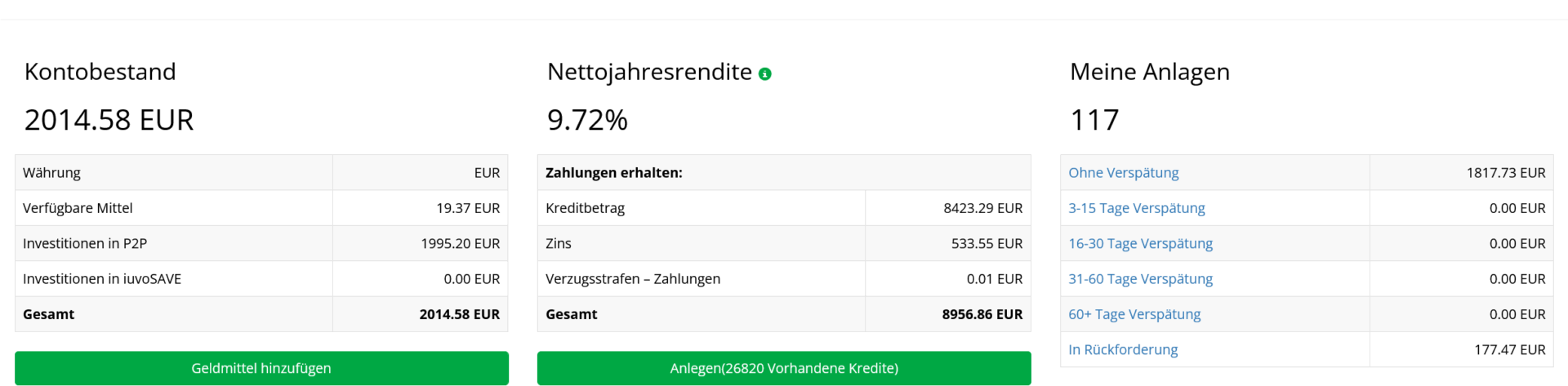 Bei Iuvo stehen 2.014,58 ⏠im Portfolio, dazu kamen 19,51 ⏠Zinsen. Die Plattform punktet mit einer vergleichsweise hohen Nettojahresrendite von knapp 10 %. Bisher laufen die RĂŒckzahlungen zuverlĂ€ssig, was Vertrauen schafft. Lediglich sind auch hier weiterhin meine russischen Kredite von Kviku in RĂŒckforderung.