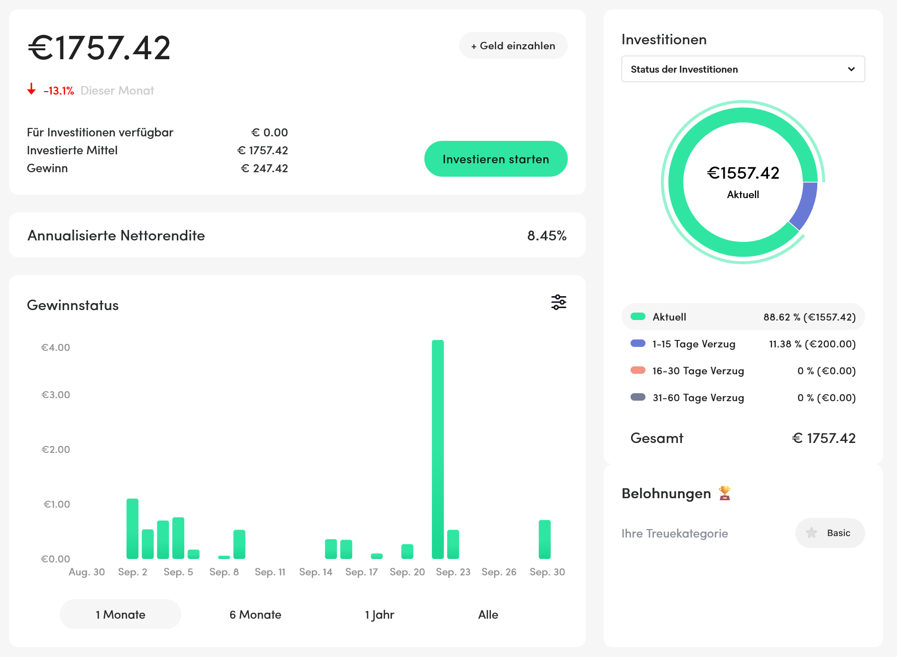 Mit einem Kontostand von 1.506,42 ⏠und Zinsen von 11,91 ⏠im September bleibt Mintos fĂŒr mich eine solide Plattform. Aktuell sind 1454,87 EUR in Kredite investiert. Leider gab es bisher keine weiteren RĂŒckholungen der russischen Kredite. Ebenso gibt es aktuell Zahlungsverzögerungen bei den Krediten aus Kasachstan. Die Rendite ist nicht spektakulĂ€r, aber stabil. Wichtig ist hier fĂŒr mich die breite Diversifikation ĂŒber viele Kreditgeber hinweg.